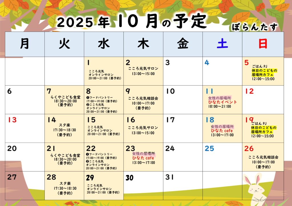 [楽家(らくや)]ぼらんたす2025年10月の予定 2025年10月1日 最終更新日時 : 2025年10月3日 ぼらんたす *ひなたイベント こものづくりワークショップ ・日 時:10月11日(土)18:00~21:00 ・会 場:楽家(鶴岡市陽光町10‐36) ・内 容:クラフトバンドでかごづくり ・参加費:軽食代+ワークショップ参加費(700) ・申込み:要予約