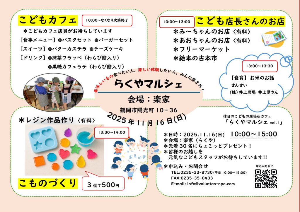 [こどもの居場所]らくやマルシェ開催します 2025年11月1日 最終更新日時 : 2025年12月16日 ぼらんたす らくやマルシェ第1回目を開催 ~美味しいもの食べたい人&楽しい体験をしたい人 みんな集まれ!~ [こんなことします] ◍こどもカフェ ◍こども店長さんのお店 ◍こものづくり ◍【食育】お米のお話 (Kurihara)