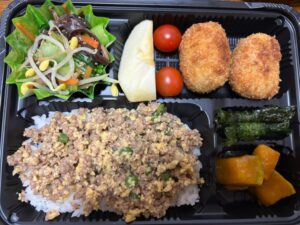 10月7日にこども食堂を開催しました。 《今回のメニュー》 ・コロッケ ・3色そぼろごはん ・揚げカボチャのあんかけ ・野菜のナムル ・しそ巻き (iwanami)